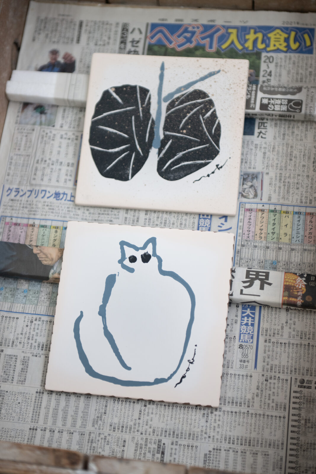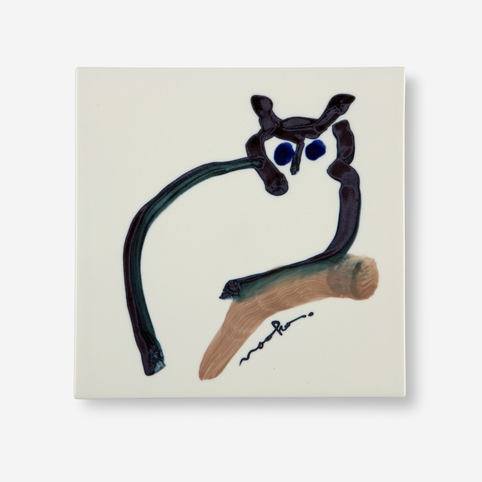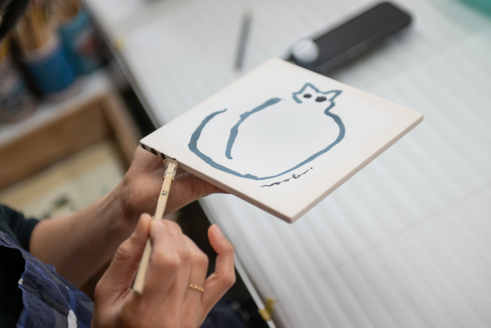 はしもと 普段からよく描いている植物や動物をモチーフにしました。もともと植物は花瓶とセットで描くことが多いのですが、今回もいつもの絵と同じように、陶板の上で生け花をするような感覚で描きました。あと、瀬戸市は招き猫の産地でもあるので、普段より猫を多く描いています。今回、呉須で描くのは初めてでしたが、以前丹波焼の絵付けをしたときの手の感触がガイドとなり、納得のいく作品に仕上がりました。